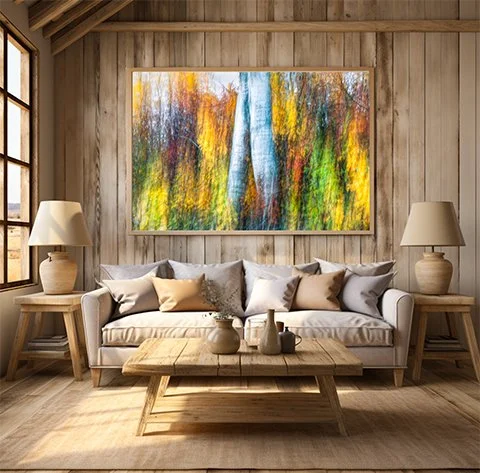 This styled interior showcases how abstract nature photography can transform a room into a warm and inviting space. The large wall art—an intentional camera movement (ICM) photograph of autumn trees in vibrant yellow, green, and orange tones—adds movement, color, and modern artistry to a rustic setting. Soft neutral furnishings, natural wood textures, and warm lighting create the perfect balance, allowing the artwork to become the focal point without overwhelming the space. This image is a beautiful example of how fine art photography can elevate a living room, blending comfort, nature, and contemporary style.
