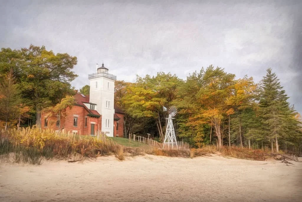This peaceful lakeside lighthouse scene (40 Mile Point Lighthouse on Lake Huron) blends warm autumn color with timeless coastal charm. The crisp white tower and historic brick keeper’s house stand nestled among golden trees, while soft grasses frame the sandy shoreline in the foreground. The painterly tones and gentle light give the image a nostalgic, serene quality, perfect for anyone who loves lighthouse wall art, fall landscapes, or quiet moments along the Great Lakes.