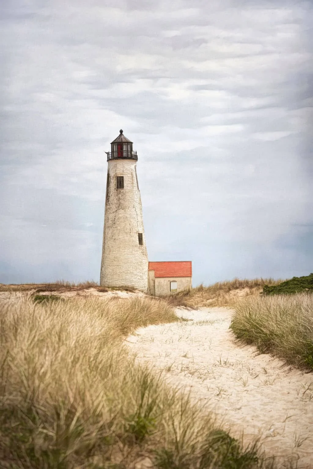 This serene lighthouse scene of Great Point Lighthouse on Nantucket Island captures the quiet beauty of the coast—weathered stone, soft dune grasses, and a pale sky that feels calm and expansive. The gentle path leading to the lighthouse draws the viewer in, making this a perfect piece of coastal wall art for anyone who loves peaceful, nautical-themed décor. Its painterly tones and timeless charm bring a sense of nostalgia and quiet elegance to any room.