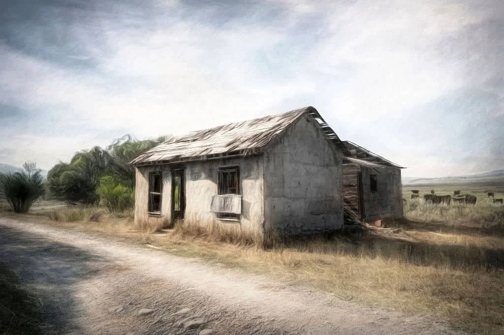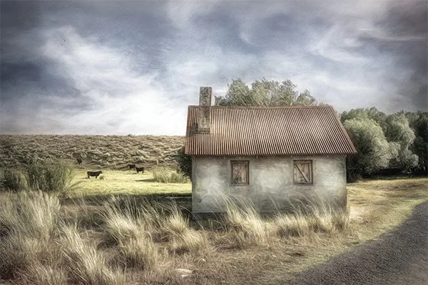 This painterly rural scene captures the quiet beauty of an old countryside cabin surrounded by golden grasses and open pastureland. The weathered tin roof, boarded windows, and simple structure speak to a life once lived at a slower pace, while grazing cattle in the distance add a touch of timeless farm life. Soft, dreamy tones and gentle textures give the image a nostalgic, almost storybook quality — the kind of place that feels paused in time, peaceful, and untouched by the rush of modern life. Perfect for lovers of rustic charm, rural landscapes, and art that evokes stillness and memory.